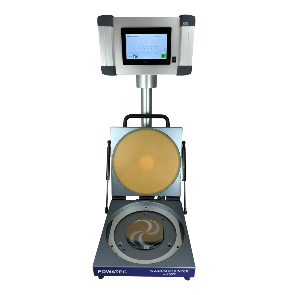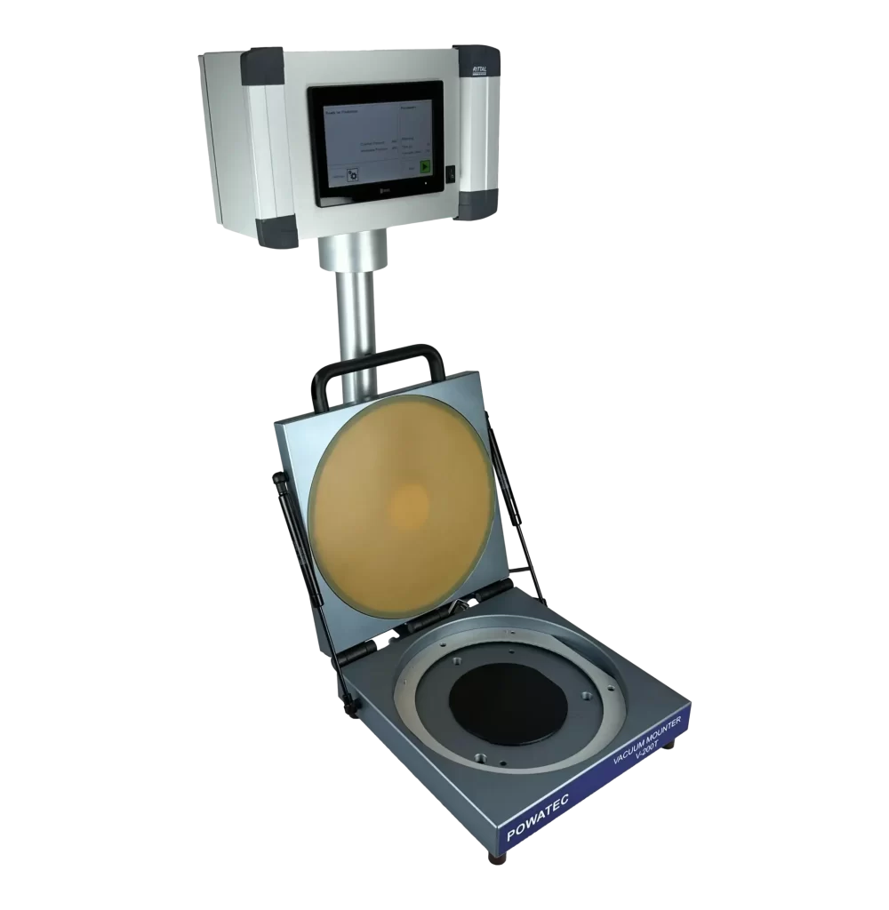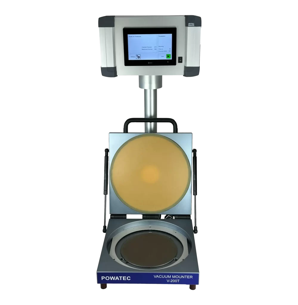 It is important to understand that the V-200T requires a frame to be mounted with a tape beforehand. That can be done on a Manual Wafer Mounter P-200 or any other mounter on the market. Once that is prepared, the wafer and the mounted frame are placed into the V-200T chamber. Once the cover is closed, the device will evacuate the chamber to approximately 2-3 mbar and then automatically bring both the structured wafer and the tape into uniform contact with each other. By applying a vacuum, a bubble-free and homogeneous mount is ensured. Finally, the chamber can be opened and the wafer mounted onto the tape and frame can be retrieved. Parameters such as pressing force, vacuum level, and timing can all be adjusted via the device HMI.